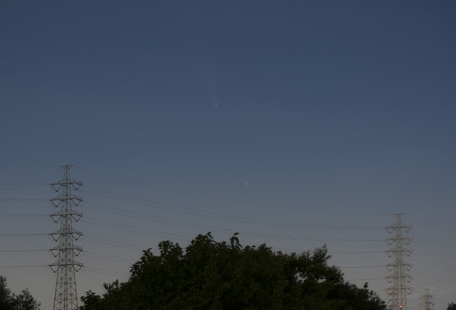 話題になっている紫金山・アトラス彗星。10月20日が見頃とのことでしたが、天気の方が微妙のようで、昨晩、近所の見晴らしのいい場所まで行ってきました。西の地平線近くを探しましたが、それらしいものは見当たらず、カメラを三脚に固定して露光時間を長く設定するとそれらしいものが見えました。さすがミラーレス!光学ファインダーでは不可能な技です。というわけで、なんとかぼんやり写る1枚を掲載します。